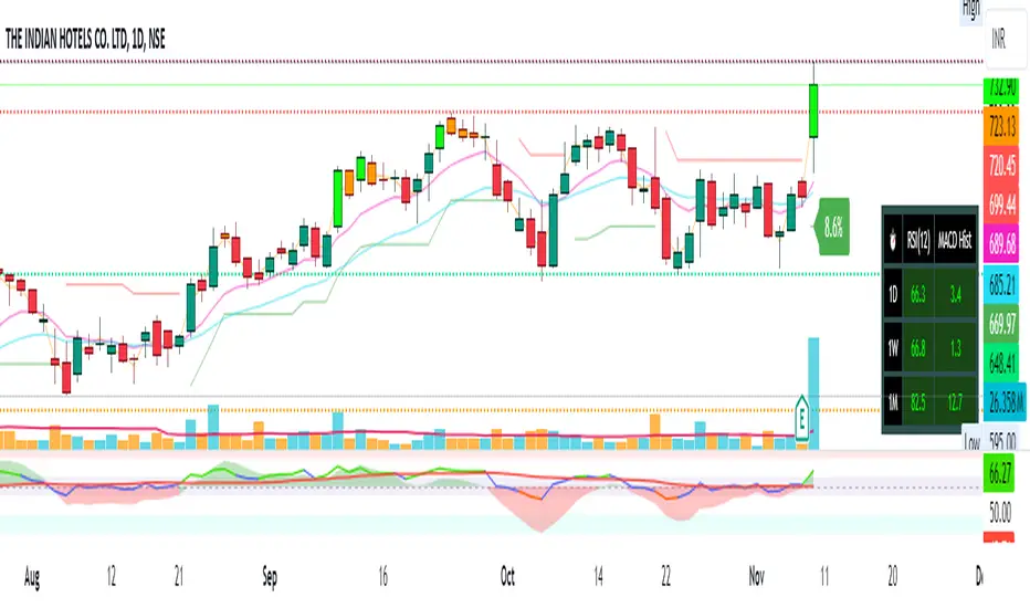 Background Fill: The RSI background dynamically changes between the overbought and oversold zones, while the MACD histogram is filled with green for bullish momentum and red for bearish momentum. This color-coding offers a quick glance at trend direction and strength.