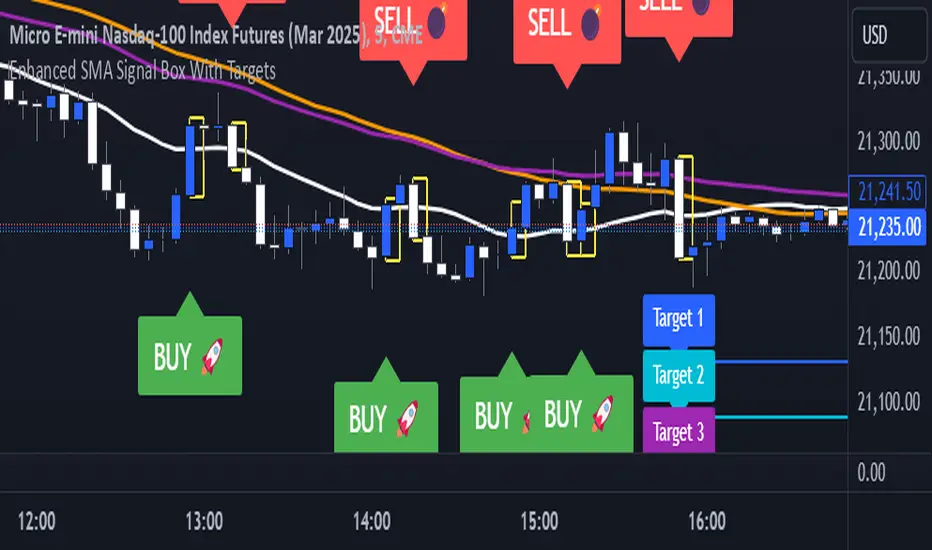 The Enhanced SMA Signal Box With Targets indicator is a versatile tool designed to help traders identify buy and sell signals based on various technical analysis methods, including Simple Moving Averages (SMA), Exponential Moving Averages (EMA), and Average True Range (ATR). This indicator provides clear visual signals and target levels to assist traders in making informed decisions.