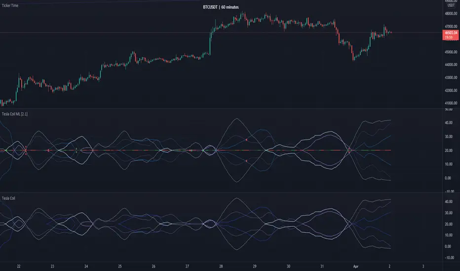 This is a re-implementation of veryfid's wonderful Tesla Coil indicator to leverage basic Machine Learning Algorithms to help classify coil crossovers. The original Tesla Coil indicator requires extensive training and practice for the user to develop adequate intuition to interpret coil crossovers. The goal for this version is to help the user understand the underlying logic of the Tesla Coil indicator and provide a more intuitive way to interpret the indicator. The signals should be interpreted as suggestions rather than as a hard-coded set of rules.
