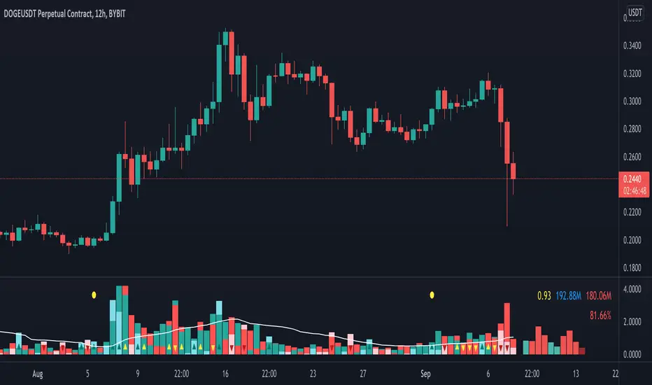 Yellow arrows signal pressure in that direction and excessive amounts of volume is required to move price. These signals can lead to reversal/ pivot points as price action struggles to continue its trend. These signals can be turned on in settings or use the overlay version of this script to display signals on chart. This is a very powerful tool when used with relative volume.