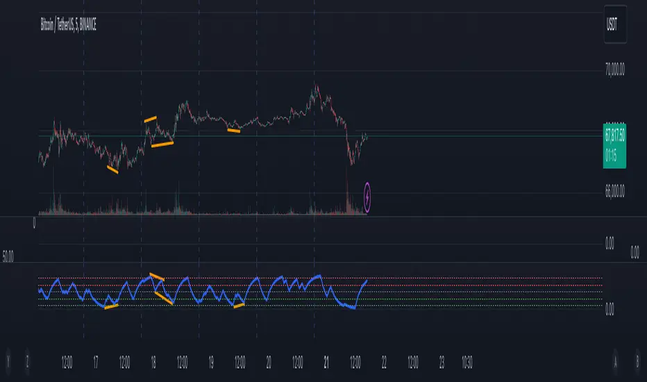Using this ratio, the Time-to-Change RSI is calculated with the standard RSI formula but applied to time instead of price. The result oscillates between 0 and 100, where values above 70 indicate a market potentially overbought (spending more time rising than falling), and values below 30 indicate a market potentially oversold (spending more time falling than rising). There are also extreme zones/divergence zones.