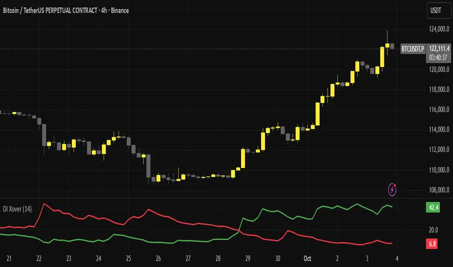 The Directional Indicator (DI) answers the first one cleanly. +DI tracks upward directional movement; –DI tracks downward directional movement. When +DI crosses above –DI, buyers have the initiative; when –DI crosses above +DI, sellers do. DI Xover [JopAlgo] focuses on that simple, tradeable signal—the crossover—and keeps the pane uncluttered so you can layer it with your location/flow tools.