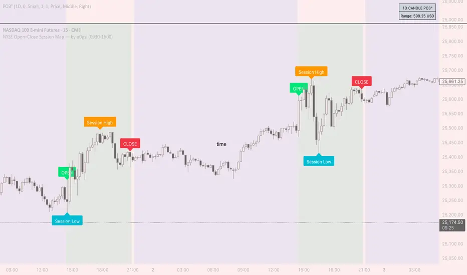 The script detects bars inside the selected session window (New York timezone). It anchors OPEN on the first in-session bar, updates the session high/low while the session is active, then anchors CLOSE on the final in-session bar and labels the high/low bars where they occurred.