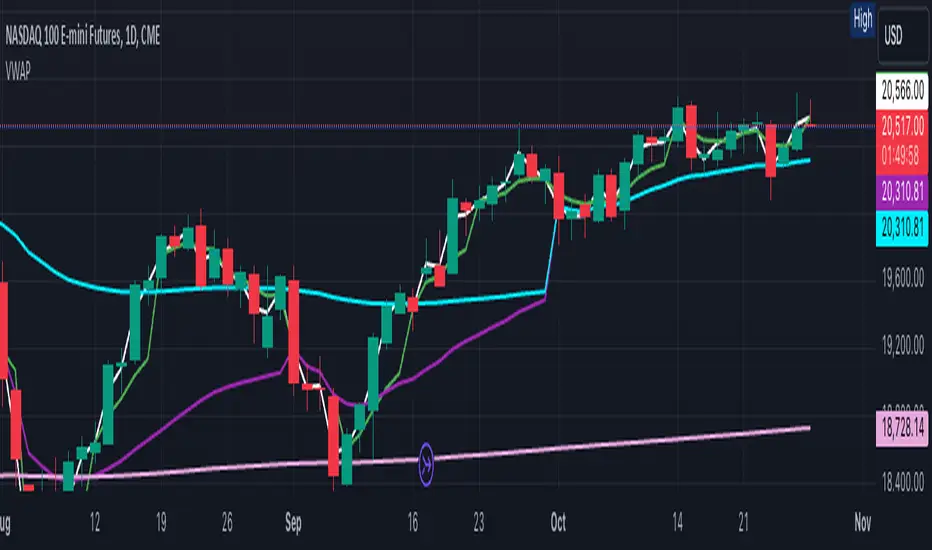 The volume-weighted average price (VWAP) is a technical analysis indicator used on intraday charts that resets at the start of every new trading session. It's the average price a security has traded at throughout the day, based on both volume and price. VWAP is important because it provides insight into both the price trend and value of a security.Why did I make this indicator? Instead of having 5 individual VWAP indicators for the daily, weekly, monthly, quarterly, and annual, I wanted one view with a clean display. This VWAP indicator combines the 5 VWAPs into one color coded view that allow styles and colors to be modified.