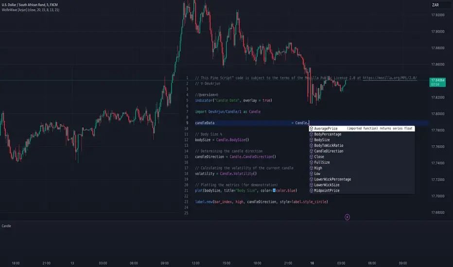 The Candle library, developed in Pine Script™, provides traders and developers with a robust toolkit for analyzing candlestick data. By offering easy access to fundamental candlestick components like open, high, low, and close prices, along with advanced derived metrics such as body-to-wick ratios, percentage calculations, and volatility analysis, this library enables detailed insights into market behavior.