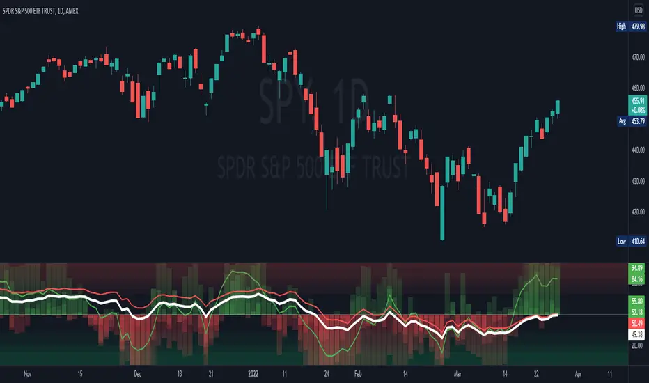 - Histogram = the change in the white line over time, for different time periods: 1/4/10/20, the "trend strength/confidence." i.e. If the white line "General Trend" has been drifting lower for a month but started increasing the past 2 days, you might have 3 red histograms and 1 green one.