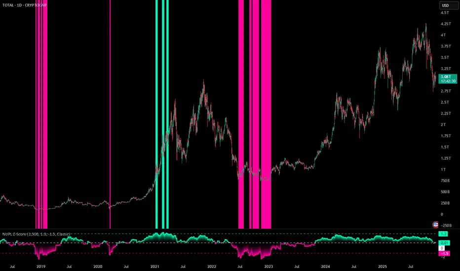 The Net Unrealized Profit and Loss (NUPL) is an advanced on-chain indicator that is measured by subtracting the Realized Value from Market Value. Realized Value takes the price of each Bitcoin when it was last moved. It adds up all individual prices and takes an average. It multiplies that average price by the total number of coins in circulation. Market Value is the current price of Bitcoin multiplied by the number of coins in circulation. This gives us the NUPL which estimates the total paper profits/losses in Bitcoin held by investors. This indicator enhances this metric by normalizing it into a Z-score, and enabling customizable features for precision and visualization.