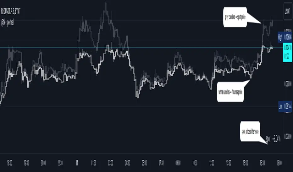 This script is an indicator that helps traders to identify the price difference between spot and futures of the current crypto plotted into the chart. It works in both types of markets, when the chart is plotting the crypto in spot market, it will compare with its respective futures ticker and vice-versa. If the current asset isn't a crypt ticker, the indicator will not be plotted into the chart.