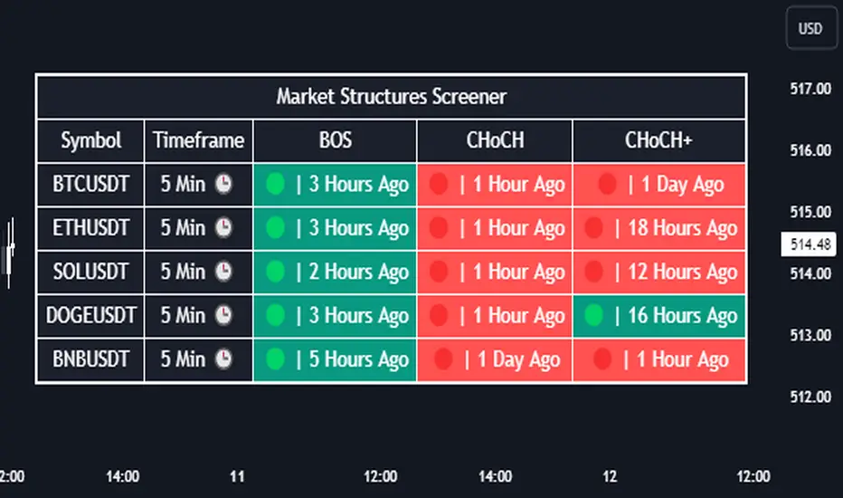 Introducing our new Market Structures Screener! This screener can provide information about the latest market structures in up to 5 tickers. You can also customize the styling of the screener.