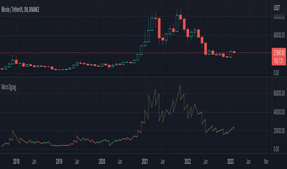 Micro zigzag is created based on similar concepts as that of zigzag but by using lower timeframe intra-bar data. The lines join candle's high/low points but also depict how the price movement within the candle happened. That is, if the high of the candle is reached first, pivot from previous candle join the high first and then low and vice versa.
