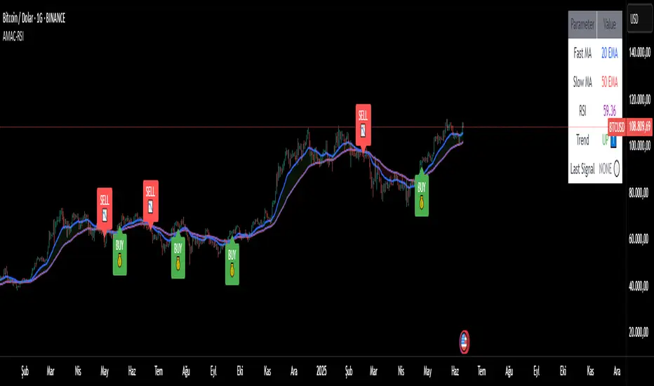 The Advanced MA Crossover with RSI Filter (AMAC-RSI) is a sophisticated technical analysis indicator that combines classical moving average crossover methodology with momentum-based filtering to enhance signal reliability and reduce false positives. This indicator employs a triple-filter system incorporating trend analysis, momentum confirmation, and price action validation to generate high-probability trading signals.