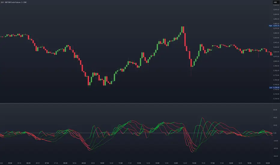 5 customizable timeframe MACD-based oscillators are programmed to give you a heads-up when momentum is rolling over and changing to a new direction by using lower timeframes as a "heads-up" of a potential change. Designed to be used on the 5 minute chart, but can be adapted for higher timeframes as well. Not recommended for charts under 5 minutes. Settings default to those recommended for a 5 in chart: 5, 4, 3, 2, & 1 min oscillators. If using on a higher timeframe, consider starting with the current timeframe and stepping each down from there. Lower timeframe oscillators will begin to roll first. Most multi-timeframe indicators keep watch for conditions on higher timeframes, this one is designed to give you a leg-up in seeing what's happening underneath the price action and squeezes by taking a peak at lower timeframes. Designed to be faster to help you make intra-day day trading decisions.