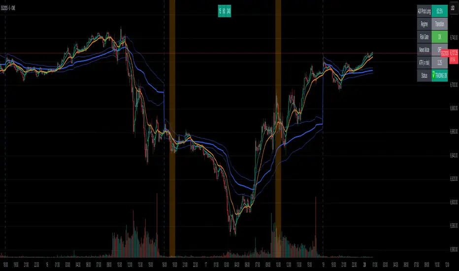 On-Chart Dashboard Panel: Presents live metrics including probability bias, regime state, ATR level, risk status, and news filters with adaptive color-coding and optional emoji cues for intuitive interpretation.
