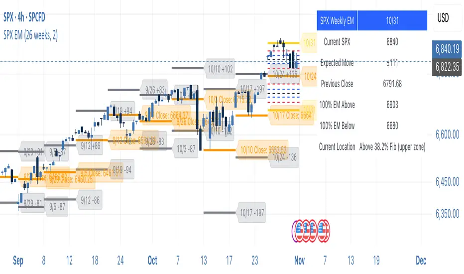 A professional Pine Script indicator for TradingView that displays weekly expected move levels for SPX based on real options data, with integrated Fibonacci retracement analysis and intelligent alerting system.