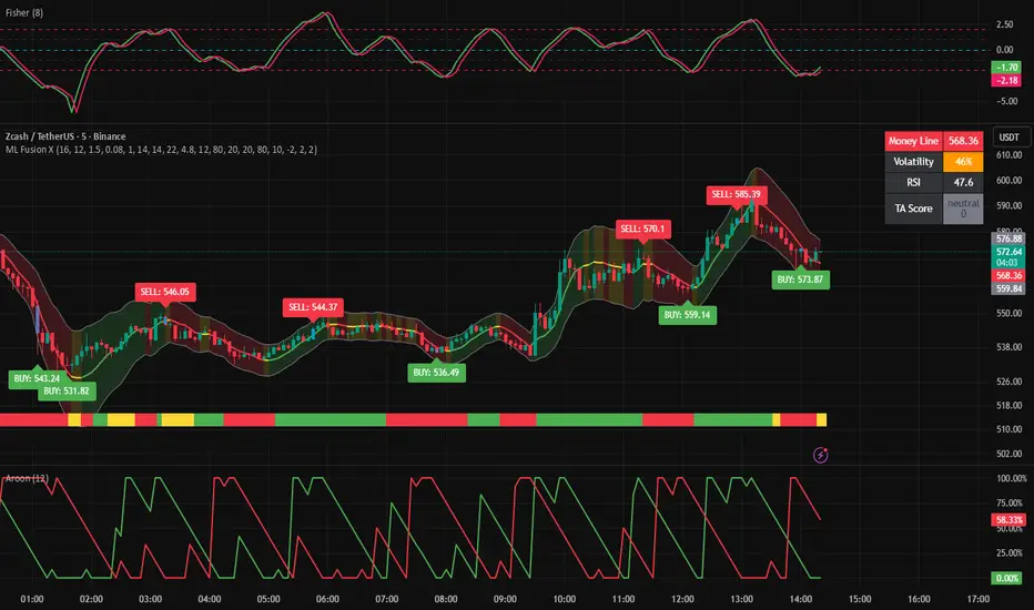 The indicator combines four technical tools into one system. The MoneyLine (smoothed trend line) shows market direction - green for uptrends, red for downtrends, yellow for choppy markets. Dynamic Bands expand and contract based on volatility, marking support and resistance zones. The Fisher Transform identifies extreme momentum - below -2.0 signals oversold (buy potential), above +2.0 signals overbought (sell potential). The Aroon indicator confirms trend strength.