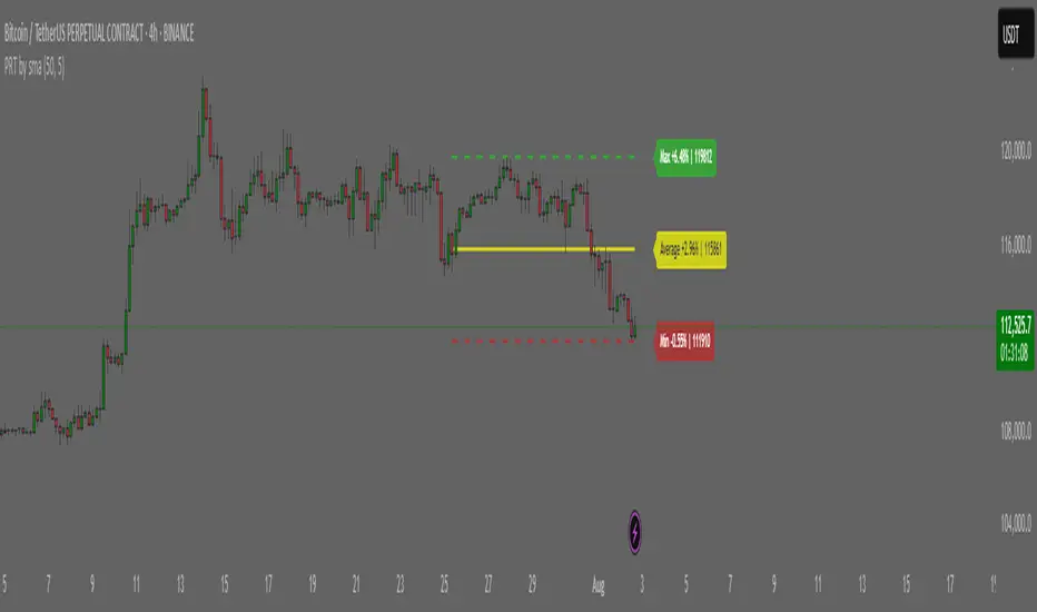 It calculates and displays the highest, lowest, and average price levels over a user-defined period (default: 50 bars).