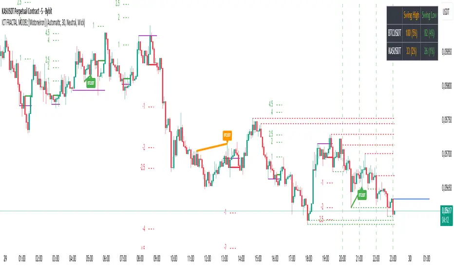 ICT FRACTAL MODEL [Motoneiron] is an advanced multi-timeframe analysis tool built for traders who study structural price behavior through the lens of Accumulation → Manipulation → Distribution (AMD).