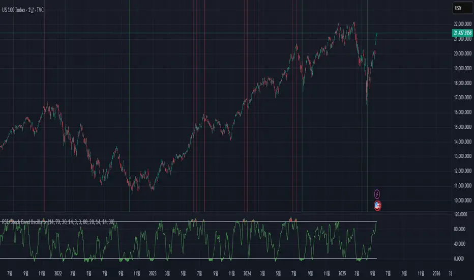 The RSI + Stochastic Band Oscillator is a technical indicator that combines the strengths of both the Relative Strength Index (RSI) and the Stochastic Oscillator. Instead of using static thresholds, this indicator dynamically constructs upper and lower bands based on the RSI and Stochastic overbought/oversold zones. It then measures the relative position of the current price within this adaptive range, effectively producing a normalized oscillator.