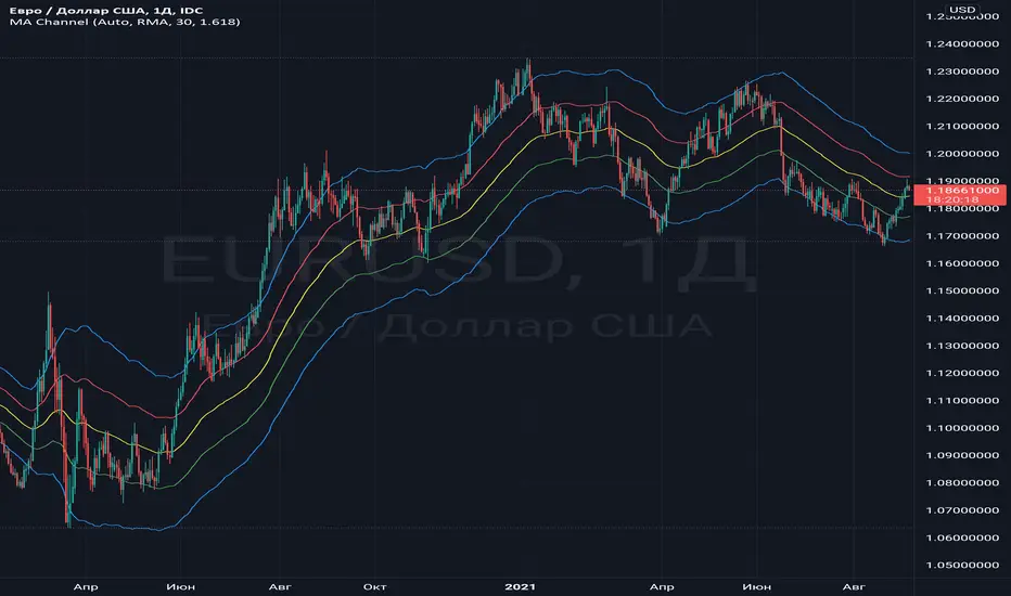 • During the flat period, the boundaries of the moving average channel narrow, the channel tends to align in a horizontal position, the price consolidates most of the time around the Middle Line level, fighting off the support and resistance levels of the indicator.