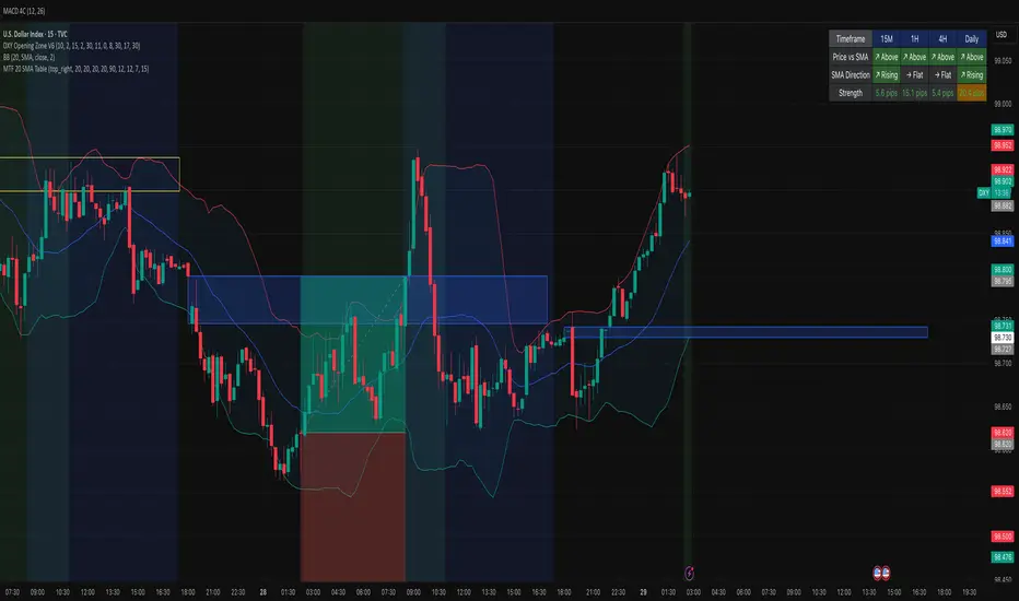 This indicator provides a comprehensive multi-timeframe analysis dashboard that displays the relationship between price and the 20-period Simple Moving Average (SMA) across four key timeframes: 15-minute, 1-hour, 4-hour, and Daily. It's designed to help traders quickly identify trend alignment and potential trading opportunities across multiple timeframes at a glance. It's definitely not perfect but has helped me speed up my backtesting efforts as it's worked well for me eliminating flipping back and forth between timeframes excpet when I have confluence on the table, then I check the HTF.