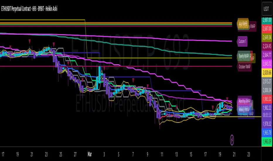 The Multi-Timeframe VWAP Suite is a comprehensive and highly customizable indicator designed for traders who rely on Volume-Weighted Average Price (VWAP) across multiple timeframes and periods. This tool provides a complete suite of VWAP calculations, including daily, weekly, monthly, quarterly, yearly, and custom VWAPs, allowing traders to analyze price action and volume trends with precision. Whether you're a day trader, swing trader, or long-term investor, this indicator offers unparalleled flexibility and depth for your trading strategy.