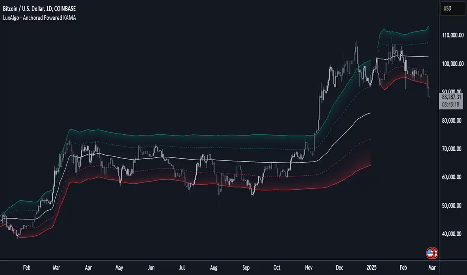 It adds 5 different anchoring periods, a power exponent to the original KAMA calculation to increase the degree of filtering during ranging trends, and standard deviation bands calculated against the KAMA itself.