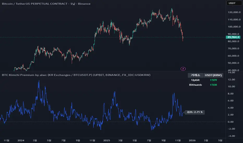 This indicator visualizes the Kimchi Premium of BTC using Korean spot exchanges and global BTCUSDT perpetual futures.