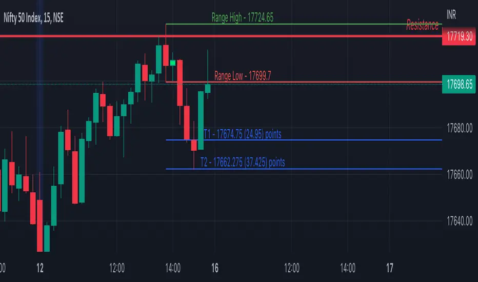 - Targets can be customised from script settings. Example, if range of mother candle is 10 points, then T1 is 10 * x above/below mother candle and T2 is 10 * y above/below mother candle. This x & y are configured via script settings