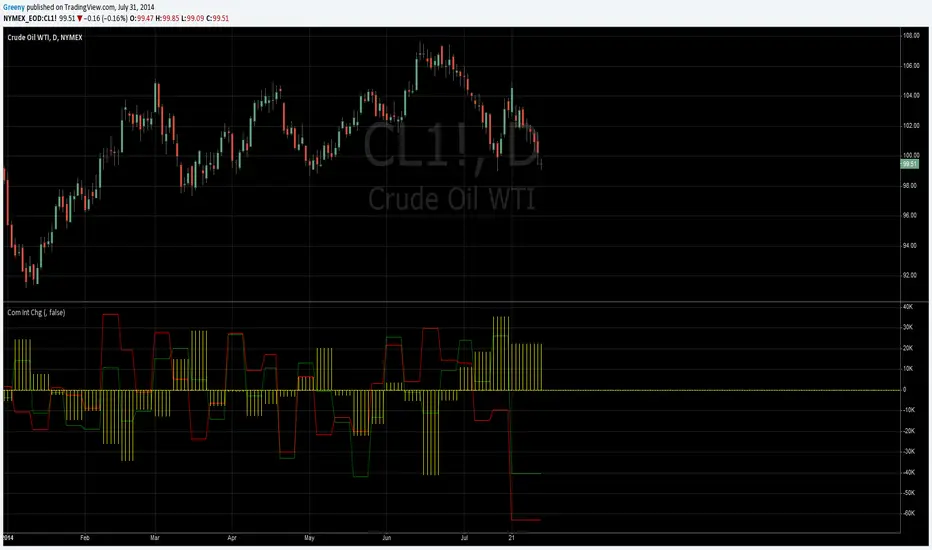 Change in Open Interest for commercial traders from legacy commitment of traders (COT) report. For the main symbol but also allows to override it. Also allows to include options in consideration.