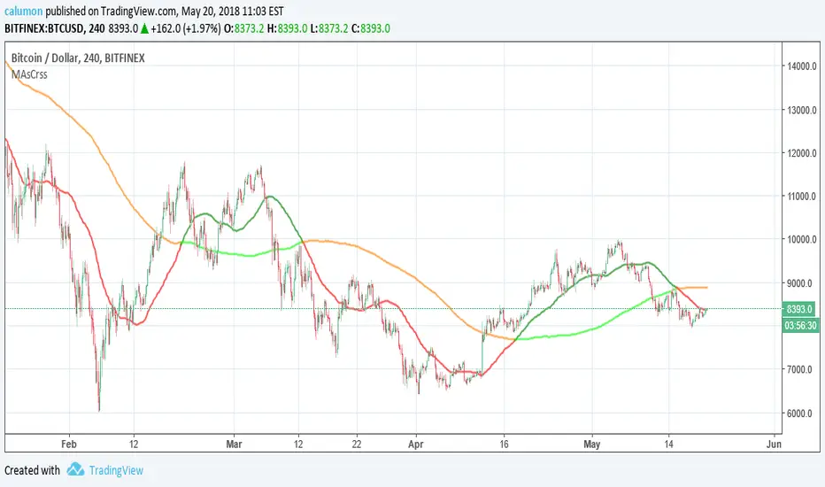 The Indicator is a mix of the MA50 and MA200. You can use crossing of both to identify trend changes into a bullish (green) or bearish (red) market.