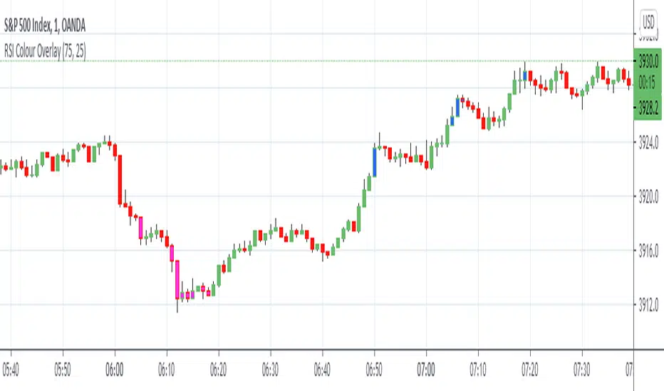 Applies Blue or Pink colour overlay to candles when RSI is at or over the predefined parameters. These parameters are adjustable in the settings area of the indicator. Please note RSI does not guaranteed a pivot point in price action and the colour overlay should only be used as an indication or condition not a call to buy or sell alone. The colour overlay is a useful prompt to review price action. I hope this helps and good luck with your analysis and trading.