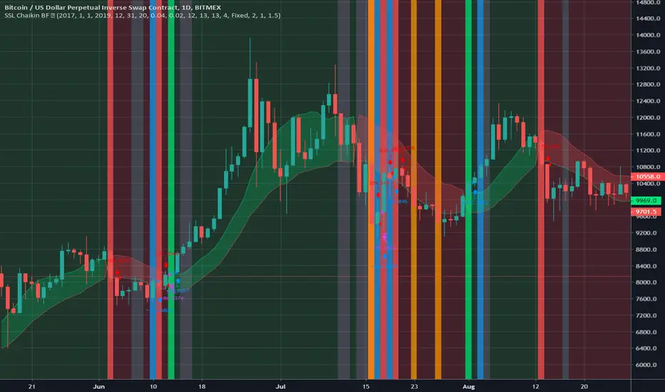 Note: The SSL signals are generated on a cross of the price and the channels but there is still an active long signal as long as price stays above the upper band, same for below the lower band for short. Similarly, the Chaikin signal occurs as long as the Chaikin line is above the upper threshold (or below the lower threshold if short).