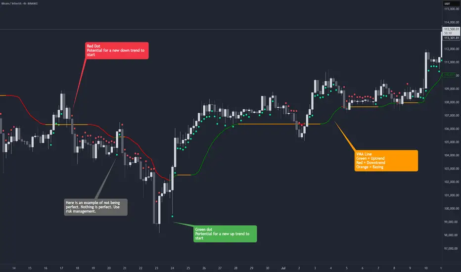 One simple way to use the indicator is if price is above VMA with green dots, look to long. If price is below VMA with red dots look to short.