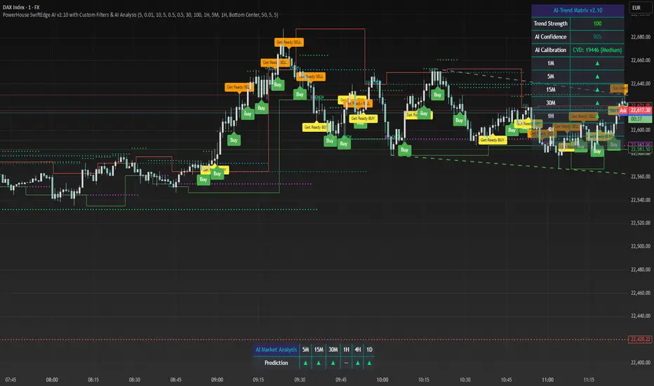 PowerHouse SwiftEdge AI v2.10 is an advanced TradingView Pine Script indicator designed to identify high-probability trading setups by combining pivot-based structure analysis, multi-timeframe trend detection, and adaptive AI-driven signal filtering. The script integrates Change of Character (CHoCH) and Break of Structure (BOS) signals with customizable momentum, volume, breakout, and trend filters to enhance trade precision. Additionally, it offers an optional AI Market Analysis module that predicts future price trends across multiple timeframes, providing traders with a comprehensive market outlook.