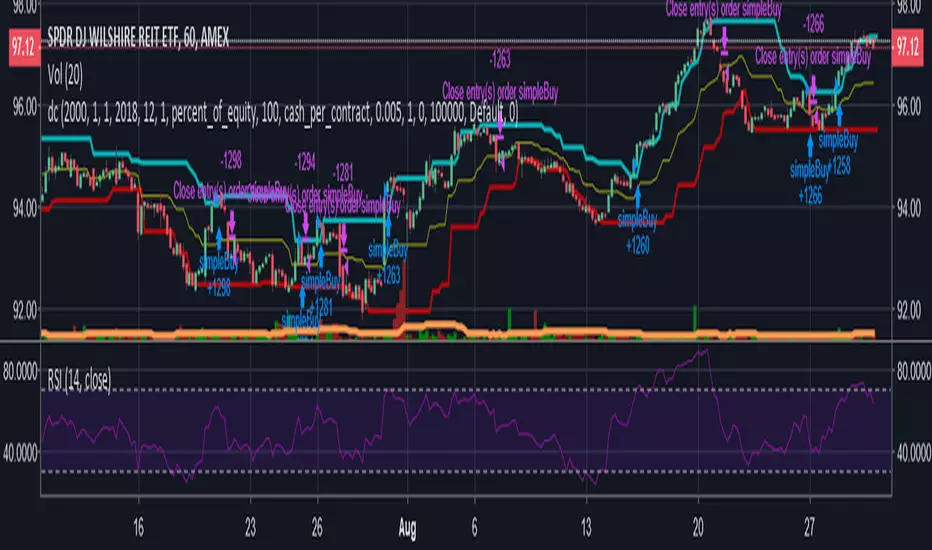simple donchian channels strategy. can be modified for long or short, futures / equities / crypto / forex