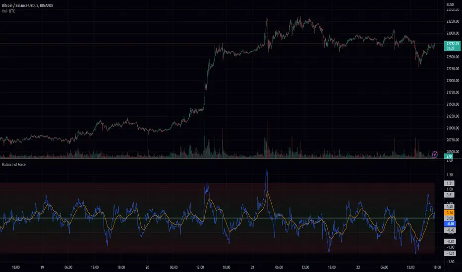 The script "Balance of Force" is an indicator that aims to provide insight into the bullish and bearish forces present in the market by analyzing the relationship between bullish and bearish true ranges. The indicator first calculates the bearish and bullish true ranges by taking the absolute difference between the open and close prices for each period and summing these values over a user-specified length. It then calculates the ratio of the bullish true range to the bearish true range and takes the natural logarithm of this value, resulting in the "bullish-bearish ratio".
