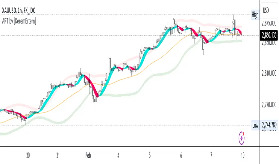 • Interpretation: Green ART signal bars indicate bullish trends, while red bars indicate bearish trends. The trend line color changes from cyan to magenta based on the trend direction.