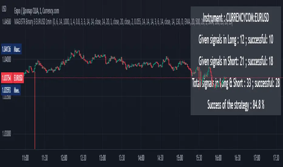 Разработан для ТФ 1 минута, пара EURUSD (оттестирован на показателях инструмента биржи Currency.com).