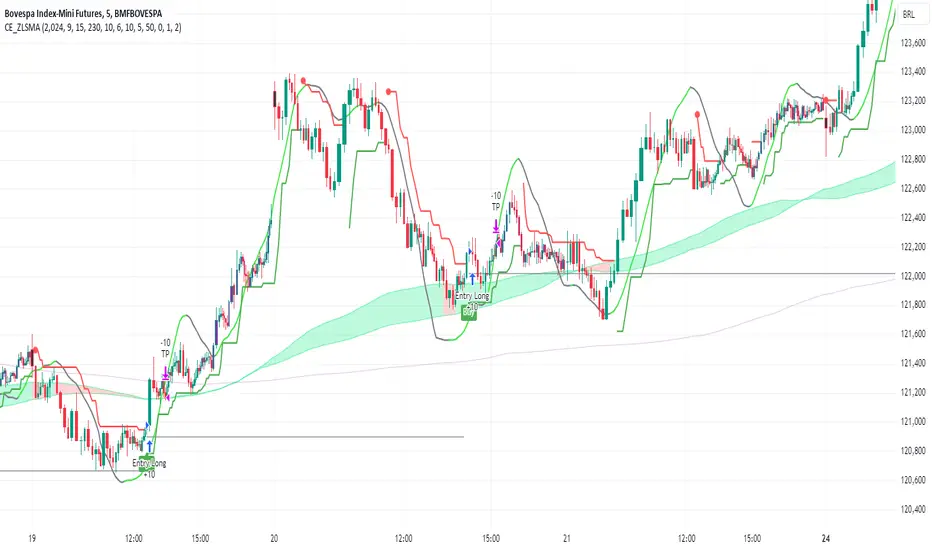 It incorporate already built indicators (ZLSMA) and CandelierExit (CE)