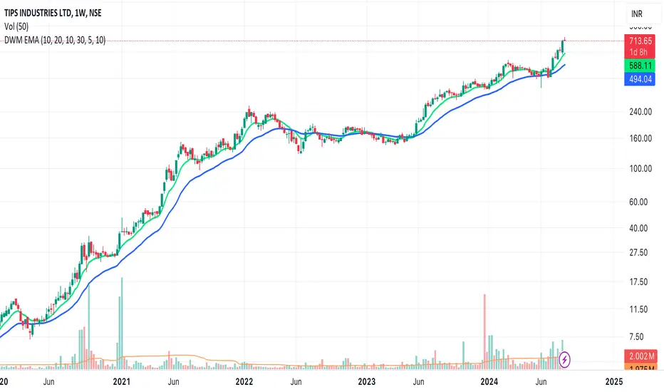 - Weekly EMAs: For Weekly charts, the indicator plots two EMAs with default values of 10 and 30. These EMAs help in tracking medium-term trends.