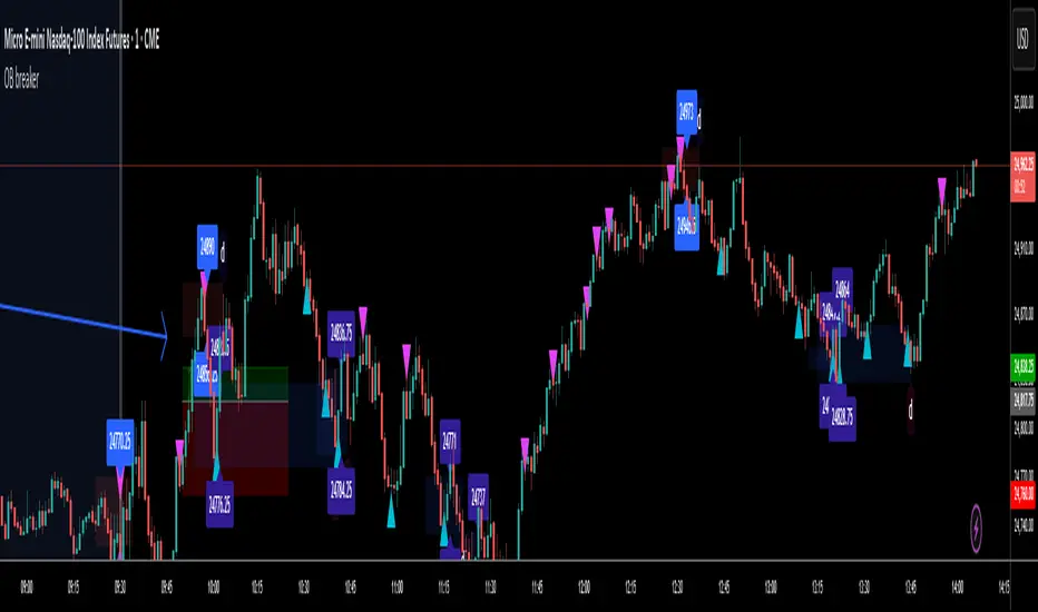 OB breaker is a system designed to trade either order blocks or breaker blocks (the opposite of the order block) as they are formed. The system detects order blocks through a very specific candle pattern to identify the order block zone. It then executes trades on either the creation of the order block or a re-test of the order block/breaker zone, whichever the user chooses.