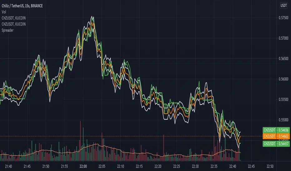 A very simple crude way to visualize a spread between Ask and Bid orders. Useful if you are trying to compare pairs to market make against using one exchange's price feed to define prices for your bot on Another exchange. Made this for myself. Might add more functionality later where rather than adding the symbol to compare it will auto add it then draw flags and count them on cross over points!