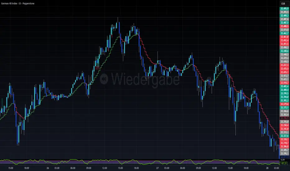 - Red → The stepped EMA is actively falling (lower lows in the staircase) → bearish higher-timeframe momentum