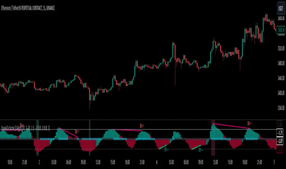 The "SqueeZe Score" is a script based on the "Squeeze Momentum Indicator". It utilizes Bollinger Bands (BB) and Keltner Channels (KC) to identify periods of low volatility, indicating potential upcoming price movements. The Z-Score method is employed to measure deviations from the mean, highlighting extreme price movements within the context of the current volatility environment. This script provides traders with visual cues for potential bullish and bearish divergences, aiding in decision-making during trading activities.