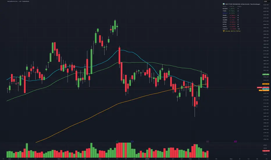 This indicator provides a real-time relative strength analysis of your stock against the top 10 constituents of its sector. By automatically detecting the sector (Technology, Financials, etc.) and comparing performance over your chosen timeframe (1D, 1W, 1M, etc.), it assigns a clear Percentile Rank (e.g., 9/10) to help you identify sector leaders and laggards.