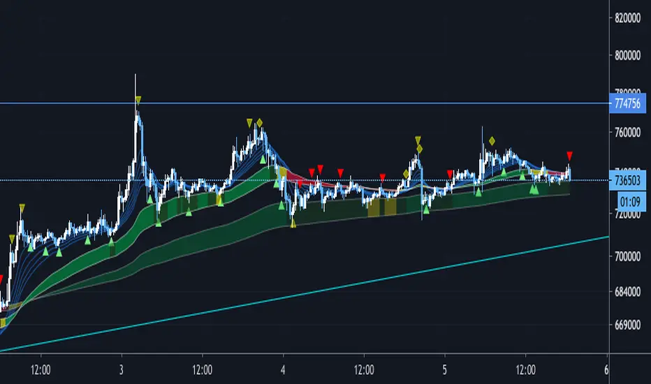 We have set a period such as EMA to use 5 minute bars and the first band is period 60 and 100 EMA . The color of the belt changes according to the position of the period 5EMA-25EMA-50EMA. The second sash is based on a 60- and 100-EMA period of 15 minutes. The change in the color of the obi is also a 15-minute specification.