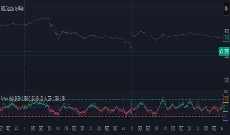 This indicator compresses multiple behavioral signals into a single Fear–Greed Index (FGI) that ranges from –100 (extreme fear) to +100 (extreme greed). It blends three psychology-based components—Prospect Theory, Herding, and Social Impact Theory (SIT)