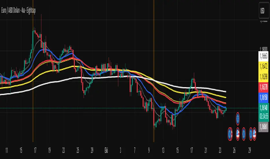 When the price distance exceeds the user-defined threshold (default: 0.50%), a visual signal (orange triangle) appears on the chart.