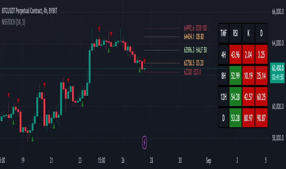 I added options for users to define the Extreme Overbought and Oversold values, also simple Oversold and Overbought values of the stochastic, default Extreme Overbought at 100, Extreme Oversold at 0, the 20 for Oversold and 80 as Overbought, plus the middle stochastic level = 50.