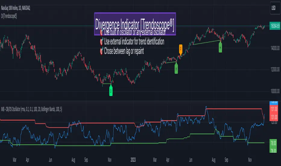 - Flexible Oscillator Integration: Choose from a wide range of built-in oscillators or import your own, including options like the innovative Multiband Oscillator. This versatility extends to using volume indicators like OBV for divergence calculations, broadening the scope of analysis.